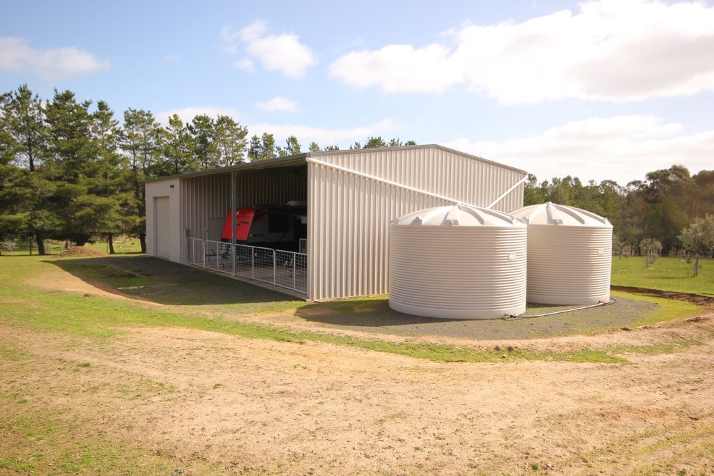 This custom shed is designed for the owners caravan and trailers and features wide bays and custom gates
