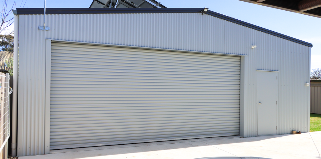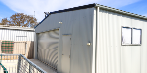 Following the phone call and the site visit, the shed that the customer thought would be perfect for their needs was a 9.1m x 9.1m x 3.1m gable roof shed with an 8° pitch that also includes a personal access door and a motorised roller door for entry and exit and 2 sliding windows and 2 whirly birds for ventilation. Wanting more subtle colours that would blend in rather than stand out too much the customer chose to clad their shed in Colorbond Shale Grey, Monument and Windspray.