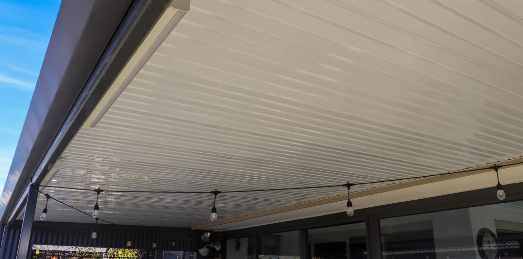 The patio measures 2.4m high x 7.7m long and features Slate Grey columns, downpipes, and gutters, with a Gun Metal and Alpine roof to complement the house and existing outdoor structures. Designed to attach seamlessly to the fascia, it flows naturally from the home.