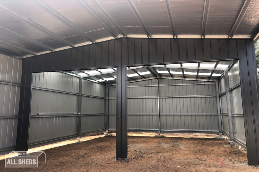 The shed is cladded in Colorbond Woodland Grey and includes 1 personal access door, 2 roller doors, 6 skylights and a window.
