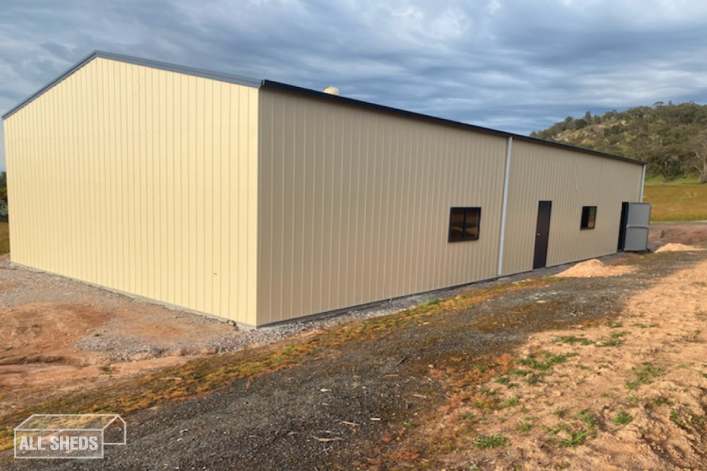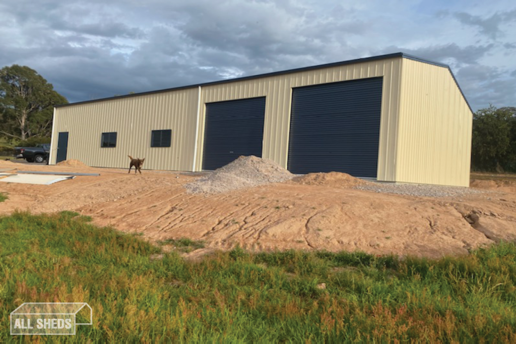 After discussing the required needs with the customer, they decided to go with a 20m x 9.5m x 3.8m gable roof economy shed with a 12.5° pitch roof. To ensure there was lots of access to the shed, they decided to include 3 x 2040H x 820W personal access doors, a 2040H x 1100W personal access door, 2 manual operated rollerdoors, and a chain operated rollerdoors. The shed also includes plenty of ventilation with 4 sliding windows and 2 whirly birds. The customer decided to cladded the shed in Colorbond Classic Cream and Deep Ocean.