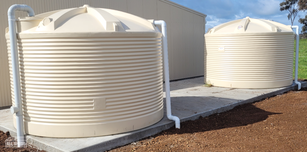 The customer spoke with the All Sheds team to discuss their requirements for the shed to help narrow down their available options. The customer was looking for something that would provide them with a large amount of storage space and provide enough height to be able to store tall items. After discussions with the All Sheds team and reviewing their available options, the customer opted for a 20m x 10.1m x 2.7m Premium American Barn with a 12.5° pitch roof cladded in Colorbond Paperbark. For easy access to the shed, the customer opted to include an automatic roller door along with 4 personal access doors. To ensure the shed has plenty of light the customer chose to include 5 windows along with an apex window on the front of the shed. Taking advantage of the water collection properties of the shed the customer also opted to include 2 water tanks that will help them collect rainwater to reuse around their property.